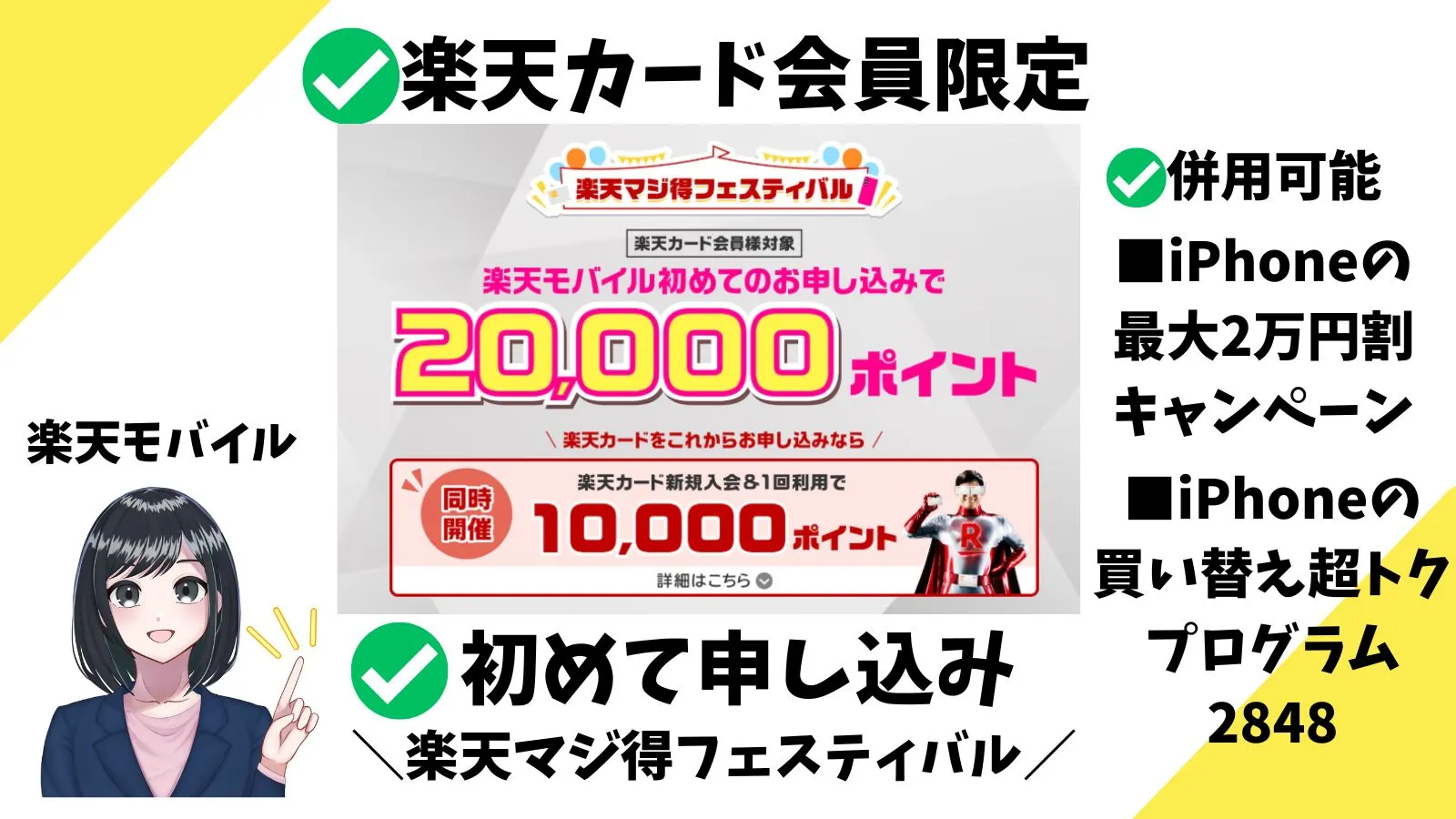 ただし、初めての申し込みの方は、2万ポイントもらえる「楽天マジ得フェスティバル」のほうがお得な場合が多いです。