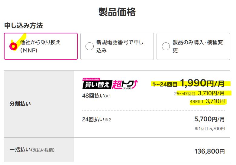 ▼楽天モバイル「買い替え超トクプログラム」利用時の負担額比較