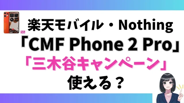 端末 Nothing CMF Phone 2 Pro購入で「三木谷キャンペーン」は使える?楽天モバイル 楽天モバイルの「Nothing CMF Phone 2 Pro」は2025年7月22日発売です。「三木谷キャンペーン」を使ってMNP14,000ポイント、MNP以外7,000ポイント(増量中は11,000ポイント)もらって申し込める?結論か... 2025.11.12 2025.11.13 端末