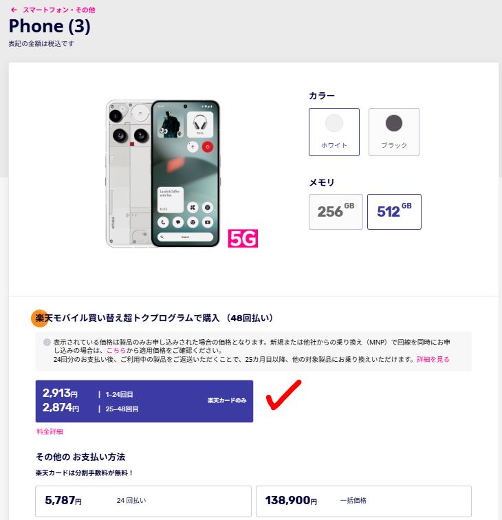 「Phone (3)」を購入する時に、本人名義の楽天カードで48回払いで買うと、「買い替え超トクプログラム」を申し込めることが分かりました。